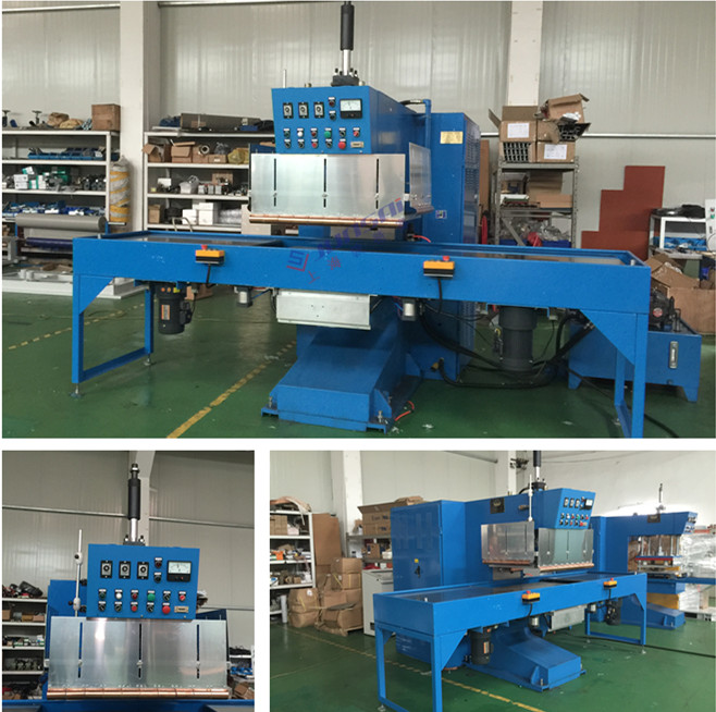 通過人工放料,高周波自動熱合壓邊切熔,定型,工作時通過人工放料,放入模具位置上,按起動開關,底部模具滑板自動滑動到固定工作位置,機頭氣缸驅動工模下降,通過延時預熱、高周熔接、切斷、定型,定型完畢機頭上升,底部工模滑板自動滑出,人工取出成品。在生產中可自由設置各部時間,一般為3--6秒一個作業過程。